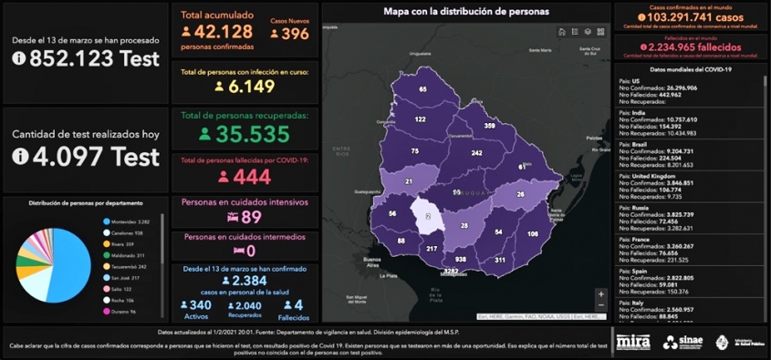 De los 396 casos nuevos, 252 son de Montevideo, 37 de Canelones, 25 de Rivera, 15 de San José, 14 de Paysandú, 10 de Tacuarembó, 9 de Maldonado, 7 de Durazno, 6 de Colonia, 5 de Rocha, 5 de Salto, 4 de Artigas, 3 de Soriano, 1 de Cerro Largo, 1 de Florida, 1 de Lavalleja y 1 de Treinta y Tres.