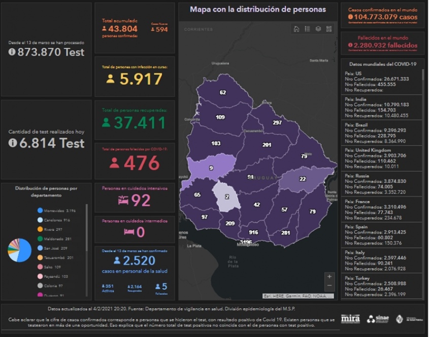 De los casos nuevos, 341 son de Montevideo, 57 de Canelones, 27 de Rivera, 24 de Paysandú, 22 de Maldonado y 20 de San José