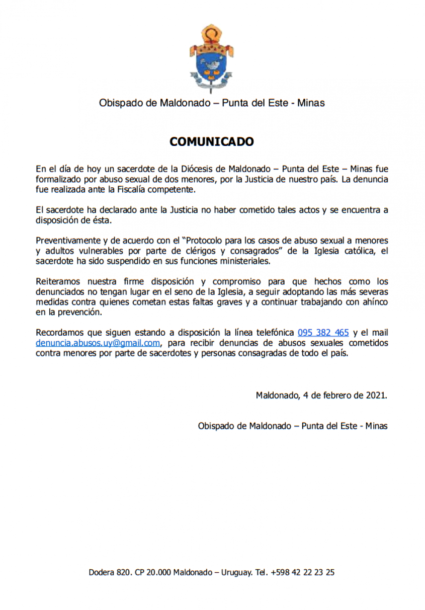 El siguiente es un comunicado librado por el Obispado de Maldonado-Punta del Este-Minas: