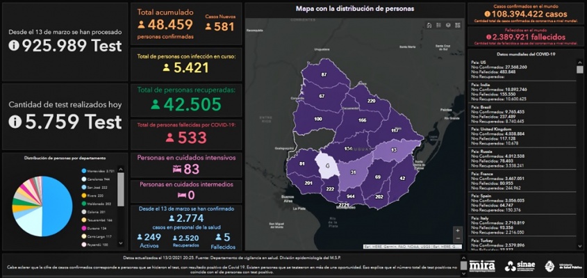De acuerdo a la información proporcionada por el Ministerio de Salud Pública (MSP), hoy se llevaron a cabo 5759 análisis y se detectaron 581 nuevos casos de COVID-19.