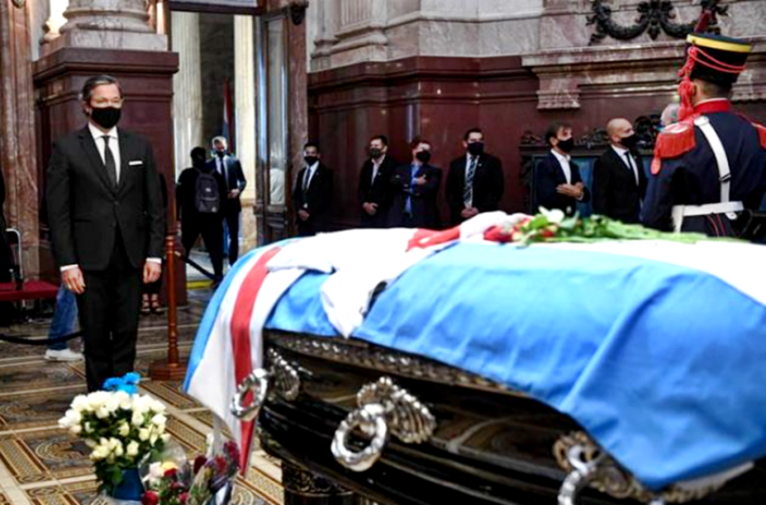 El actual mandatario, Alberto Fernández, que decretó ayer tres días de duelo nacional, se acercó anoche unos minutos a la capilla ardiente que fue instalada en el Congreso.