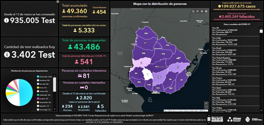 De los 454 casos nuevos, 247 son de Montevideo, 55 de Canelones, 27 de Rivera, 18 de Paysandú, 16 de Maldonado, 14 de San José, 13 de Artigas, 12 de Durazno, 11 de Salto, 9 de Cerro Largo, 8 de Colonia, 7 de Río Negro, 5 de Tacuarembó, 4 de Soriano, 3 de Lavalleja, 3 de Rocha, 1 de Florida y 1 de Treinta y Tres.