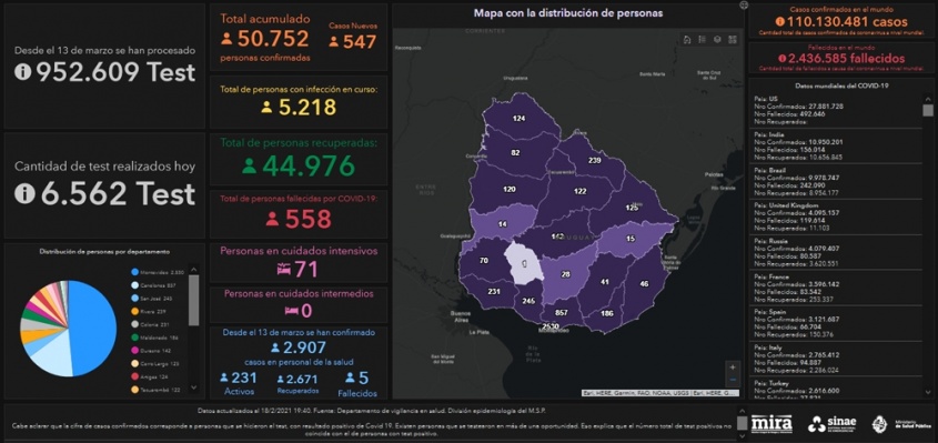 De acuerdo a la información proporcionada por el Ministerio de Salud Pública (MSP), hoy se llevaron a cabo 6562 análisis y se detectaron 547 nuevos casos de Coronavirus COVID-19.