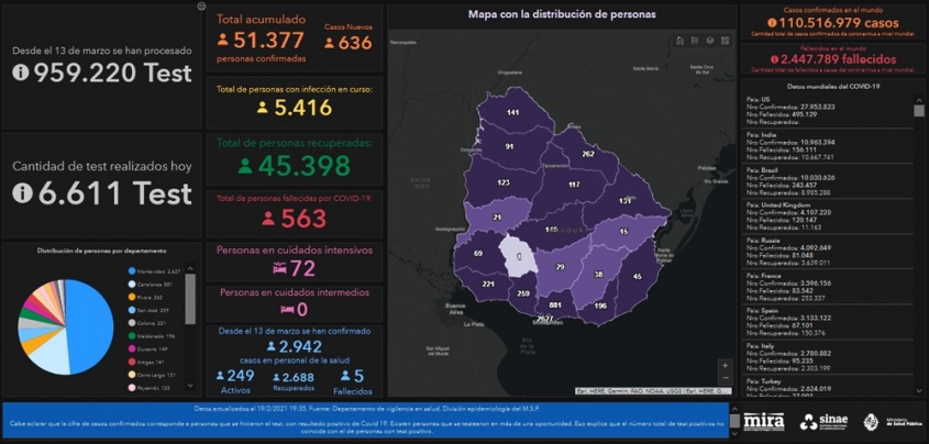 De los 636 casos nuevos, 326 son de Montevideo, 79 de Canelones, 36 de Rivera, 29 de Maldonado, 24 de San José, 23 de Durazno, 22 de Artigas, 17 de Cerro Largo, 17 de Tacuarembó, 15 de Colonia, 15 de Paysandú, 13 de Salto, 7 de Río Negro, 5 de Florida, 4 de Rocha, 3 de Soriano y 1 de Lavalleja. En todos los casos se trabaja en un7 estricto seguimiento epidemiológico.