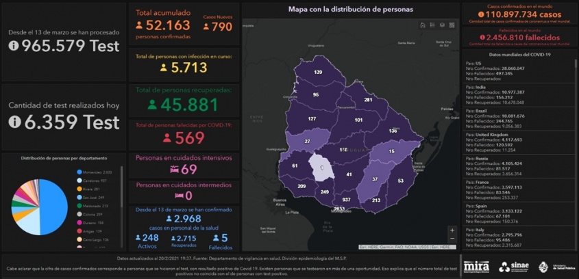 De acuerdo a la información proporcionada por el Ministerio de Salud Pública (MSP), hoy se llevaron a cabo 6359 análisis y se detectaron 790 nuevos casos de Coronavirus COVID-19.