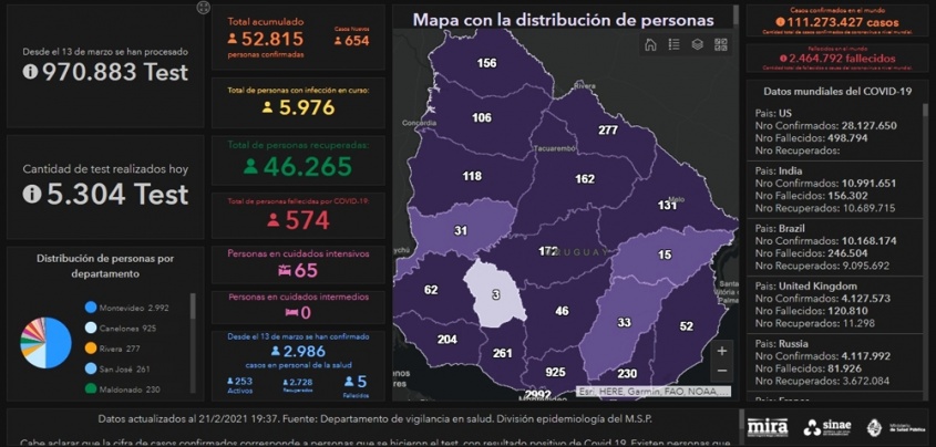 De acuerdo a la información proporcionada por el Ministerio de Salud Pública (MSP), hoy se llevaron a cabo 5304 análisis y se detectaron 654 nuevos casos de Coronavirus COVID-19. De los 654 casos nuevos, 373 son de Montevideo, 69 de Tacuarembó, 40 de Canelones, 28 de Maldonado, 25 de Rivera, 22 de Artigas, 18 de Durazno, 14 de Salto, 13 de Colonia, 13 de San José, 10 de Paysandú, 9 de Cerro Largo, 7 de Florida, 4 de Río Negro, 3 de Soriano, 2 de Flores, 2 de Rocha, 1 de Lavalleja y 1 de Treinta y Tres. En todos los casos se trabaja en un estricto seguimiento epidemiológico.