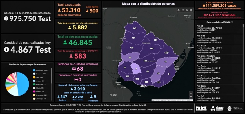 De acuerdo a la información proporcionada por el Ministerio de Salud Pública (MSP), hoy se llevaron a cabo 4867 análisis y se detectaron 500 nuevos casos de COVID-19.