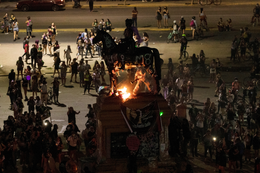El fallido intento de tumbar la gran escultura del general Manuel Baquedano, principal líder chileno de la Guerra del Pacífico, fue criticado por las manifestantes que en coro gritaban a los encapuchados consignas como "Váyanse a su casa" u "Hoy es nuestro día", según constató Efe.