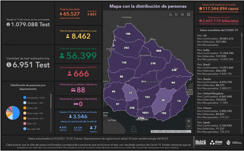 De los 831 casos nuevos, 463 son de Montevideo, 62 de Rivera, 51 de Canelones, 43 de Salto, 32 de Cerro Largo, 29 de Maldonado y 26 de Tacuarembó.