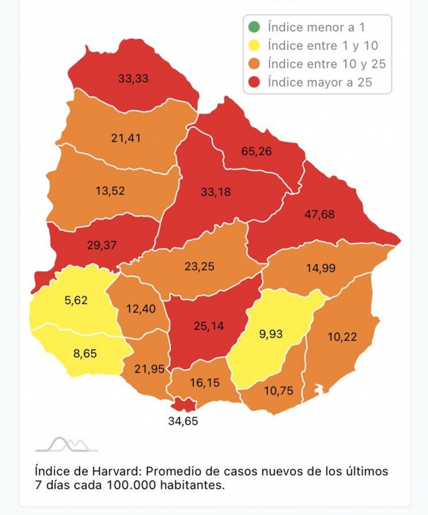 Uruguay está en la zona de riesgo roja, según el índice de Harvard, con 26,31 contagios en siete días cada 100 mil habitantes.