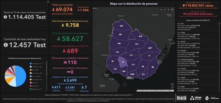 De acuerdo a la información proporcionada por el Ministerio de Salud Pública (MSP), hoy se llevaron a cabo 12.457 análisis y se detectaron 1366 nuevos casos de Coronavirus COVID-19.