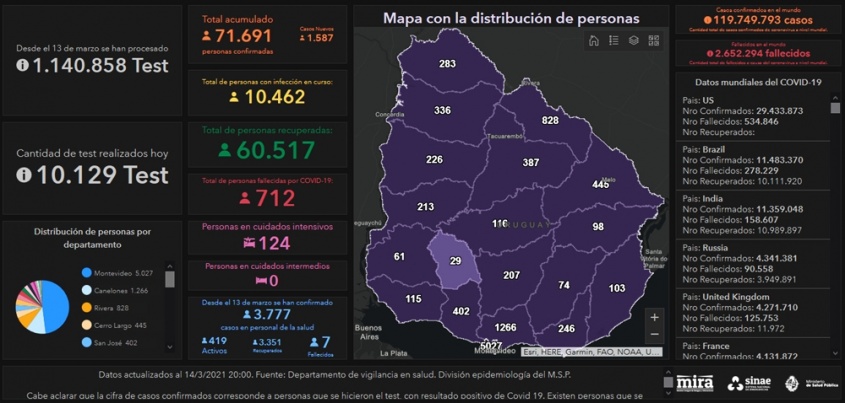 De los 1587 casos nuevos, 760 son de Montevideo, 159 de Canelones, 110 de Tacuarembó, 89 de Rivera, 75 de San José, 73 de Salto, 49 de Paysandú, 48 de Artigas, 43 de Cerro Largo, 41 de Río Negro, 33 de Durazno, 28 de Maldonado, 18 de Florida, 17 de Rocha, 17 de Treinta y Tres, 16 de Colonia, 6 de Lavalleja, 4 de Soriano y 1 de Flores.