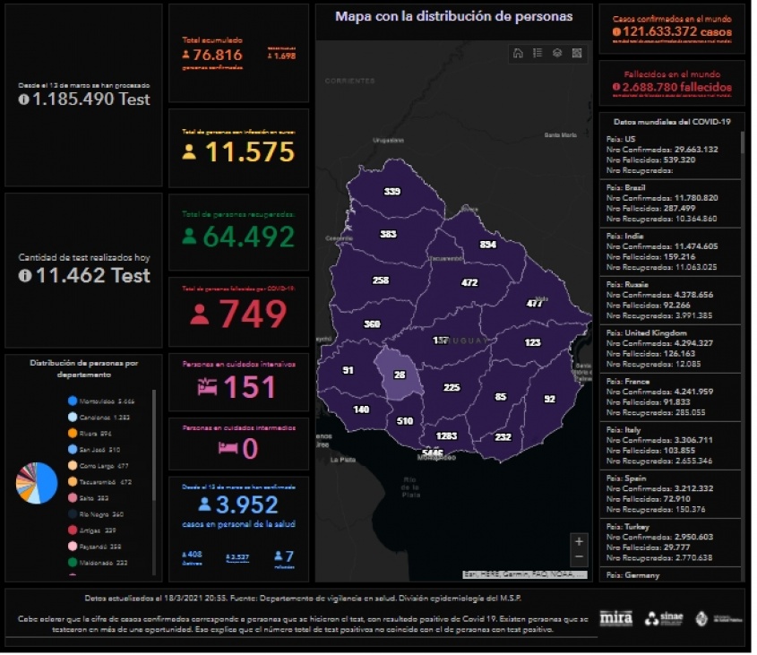 Son 836 nuevos casos de Montevideo, 125 de Canelones, 119 de Cerro Largo y 110 de Rivera. Hubo 80 nuevos casos de Río Negro, 74 de Tacuarembó, 59 de Artigas, 57 de San José, 37 de Maldonado, 34 de Florida y de Paysandú, 30 de Durazno, 28 de Colonia, 21 de Treinta y Tres, 19 de Salto, 16 de Rocha, 13 de Soriano y 6 de Lavalleja.