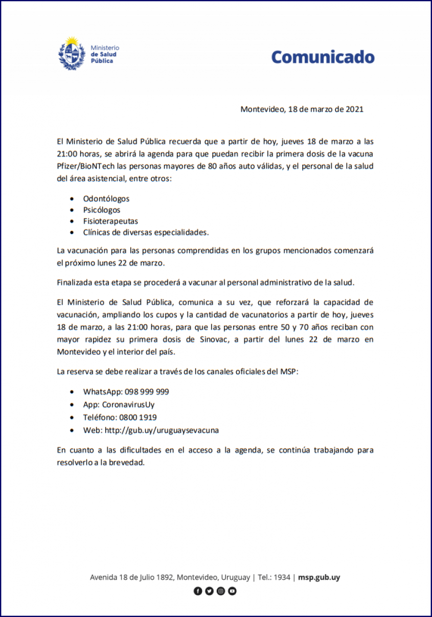 Además, durante la Semana de Turismo (Semana Santa) podrán vacunarse, previo registro en la agenda, personas de 18 a 70 años, tal y como anunció el pasado martes en conferencia de prensa el presidente Luis Lacalle Pou.