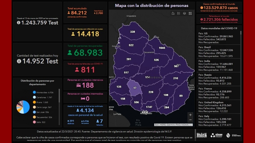 Del total de casos nuevos: 1.468 son de Montevideo, 383 de Canelones, 202 de Rivera, 102 de Salto, 97 de Rio Negro, 71 de Tacuarembó, 68 de San José, 58 de Artigas, 58 de Cerro Largo, 40 de Maldonado, 35 de Durazno, 34 de Treinta y Tres, 24 de Soriano, 17 de Colonia, 14 de Rocha, 12 de Lavalleja, 9 de Florida y 8 de Paysandú.
