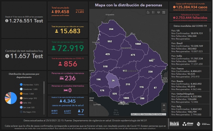 Se realizaron 11.657 análisis y se detectaron 1693 nuevos casos, de los cuales 924 son de Montevideo. Otros 157 de Canelones, 119 de Paysandú, 96 de Rivera, 81 de Cerro Largo, 42 de Salto, 36 de San José, 29 de Lavalleja, 28 de Soriano y de Treinta y Tres. Son 26 de Artigas y Tacuarembó, 24 de Río Negro, 20 de Colonia, 17 de Maldonado 13 de Durazno, 11 de Florida y Rocha y 5 de Flores.