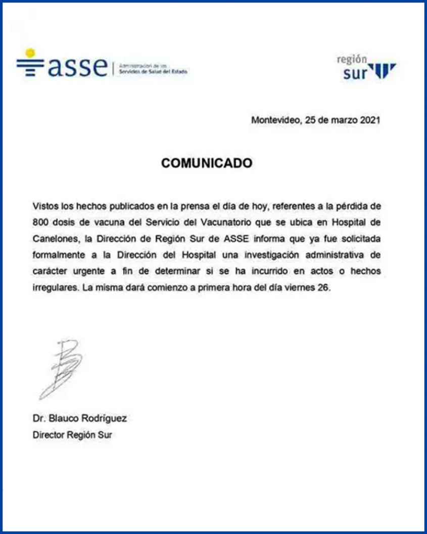 Una sucesión de errores llevaron a que que 800 dosis de la vacuna Sinovac contra el COVID-19 debieran ser desechadas en el hospital de Canelones, según informaron autoridades de ASSE, al tiempo que se ordenó una investigación administrativa.