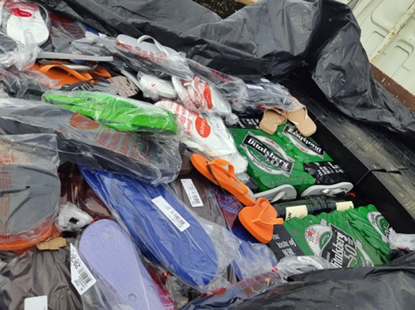 En total se incautaron 57 botellas de whisky, 120 botellas de cerveza, 48 latas de bebidas energizantes, 768 latas de cerveza y 200 pares de chinelas.
