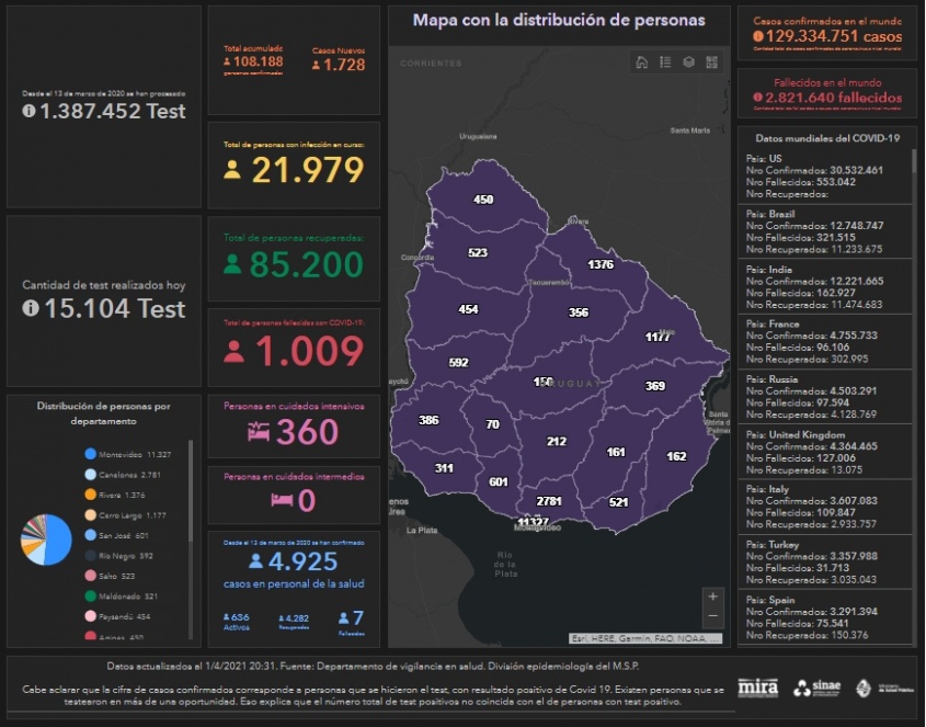 De los casos nuevos 965 son de Montevideo, 186 de Canelones, 169 de Cerro Largo, 94 de Rivera, 60 de Paysandú, 41 de Treinta y Tres, 33 de Salto, 27 de Lavalleja, 26 de Maldonado y 25 de San José. Son 24 casos nuevos de Soriano, 20 de Flores, 16 de Colonia, 14 de Artigas, 12 de Rocha, 6 de Durazno,5 de Río Negro, 3 de Tacuarembó y 2 de Florida.