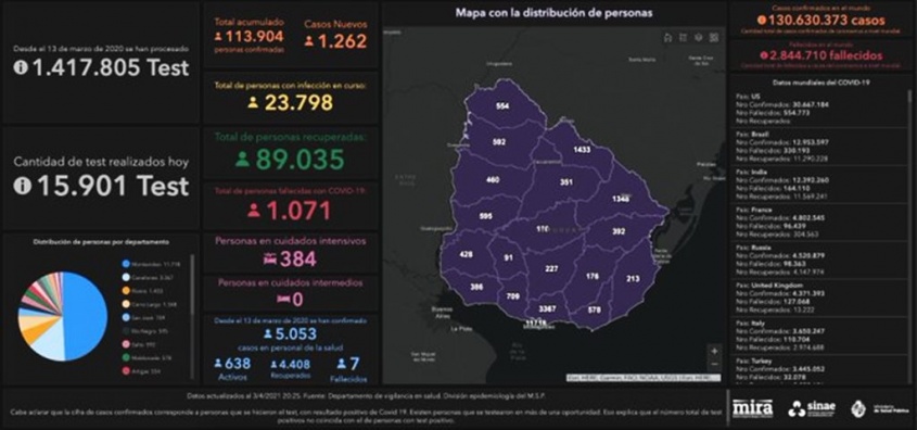 De los 1.262 casos nuevos, 544 son de Montevideo, 200 de Canelones, 69 de Rivera, 52 de Salto, 49 de Maldonado, 49 de Paysandú, 49 de San José, 43 de Soriano, 38 de Colonia, 33 de Cerro Largo, 32 de Artigas, 30 de Río Negro, 23 de Lavalleja, 16 de Florida, 13 de Rocha, 10 de Flores, 6 de Treinta y Tres, 5 de Tacuarembó y 1 de Durazno. En todos los casos se trabaja en un estricto seguimiento epidemiológico.