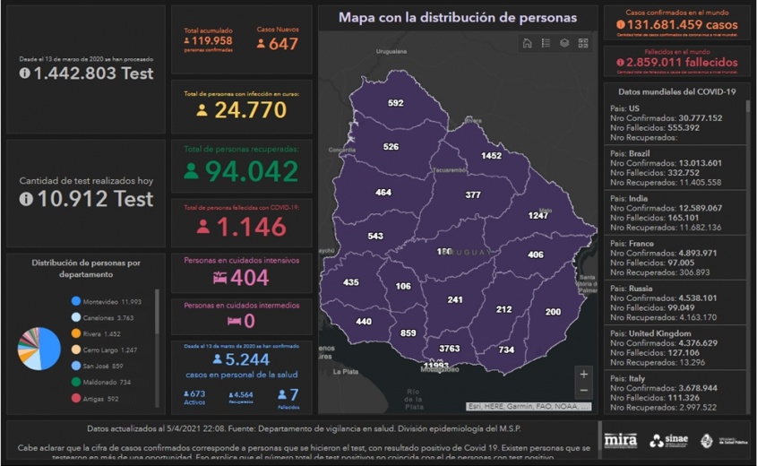 Otra vez Montevideo registró 230 casos, seguidos de 77 de Canelones, 54 de Paysandú, 45 de Colonia, 41 de San José, 38 de Salto, 35 de Maldonado y Rivera.