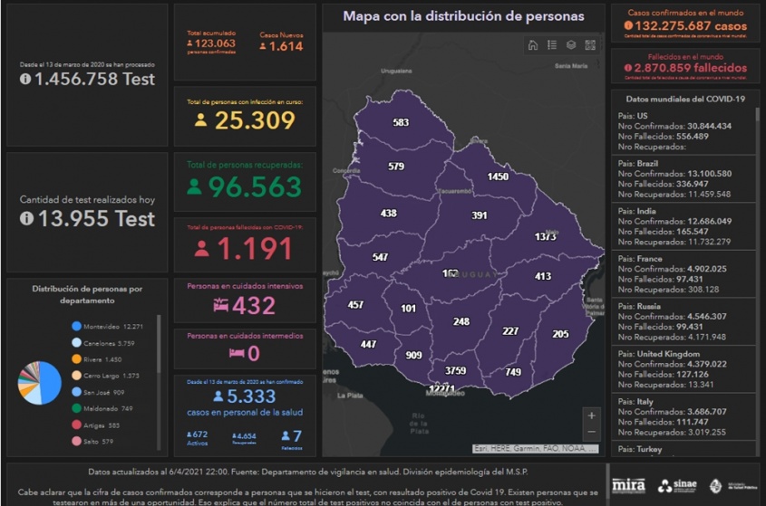 Son 679 de Montevideo, 190 de Canelones, 123 de Rivera, 112 de Cerro Largo, 78 de Salto y 78 de San José. Otros 61 casos de Maldonado, 55 de Río Negro, 50 de Soriano, 33 de Artigas, 29 de Colonia, 28 de Lavalleja, 24 de Paysandú, 23 de Treinta y Tres, 17 de Rocha, 16 de Florida, 12 de Tacuarembó, 4 de Flores y 2 de Durazno.