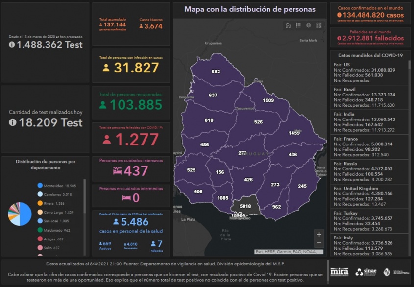 Se llevaron a cabo 15.815 análisis y se detectaron 3.786 nuevos casos de Coronavirus. De los 3.786 casos nuevos, 1919 son de Montevideo, 609 de Canelones, 147 de Rivera, 145 de Cerro Largo, 121 de Salto, 115 de Maldonado, 107 de Artigas, 114 de Tacuarembó, 85 de San José, 80 de Paysandú, 56 de Colonia, 56 de Soriano, 53 de Florida, 43 de Durazno, 34 de Lavalleja, 30 de Treinta y Tres, 29 de Río Negro, 23 de Rocha y 20 de Flores. En todos los casos se trabaja en un estricto seguimiento epidemiológico.