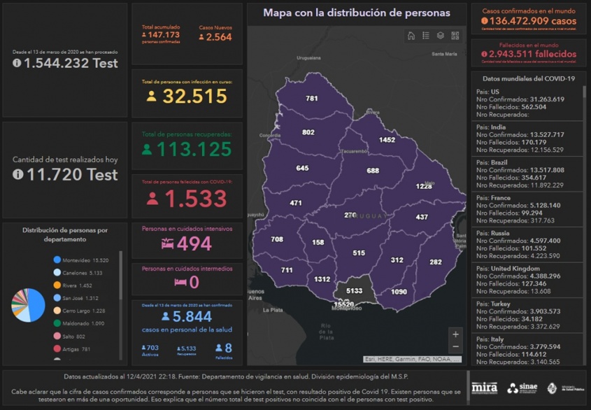 De los nuevos casos, 1251 son de Montevideo, 307 de Canelones, 113 de Artigas, 95 de Cerro Largo, 89 de Colonia, 89 de San José, 86 de Tacuarembó, 80 de Rivera, 72 de Soriano, 68 de Salto, 67 de Río Negro, 55 de Paysandú, 53 de Florida, 42 de Maldonado, 30 de Treinta y Tres, 28 de Rocha, 17 de Durazno, 13 de Lavalleja, y 9 de Flores.