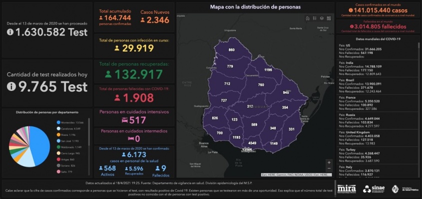 De los 2.346 casos nuevos, 1052 son de Montevideo, 262 de Canelones, 146 de Río Negro, 105 de Rivera, 102 de Paysandú, 87 de Maldonado, 83 de Cerro Largo, 82 de Artigas, 69 de San José, 68 de Salto, 62 de Florida, 57 de Soriano, 43 de Tacuarembó, 38 de Colonia, 26 de Lavalleja, 26 de Rocha, 20 de Treinta y Tres, 11 de Durazno y 7 de Flores. En todos los casos se trabaja en un estricto seguimiento epidemiológico.