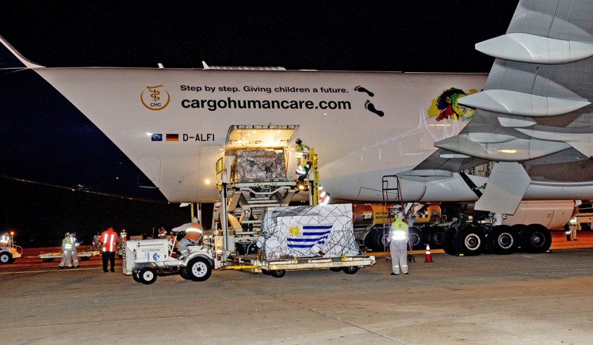 Todas las semanas arriban al Aeropuerto de Carrasco un lote de dosis de Pfizer, que comenzaron siendo de 50.000 vacunas y ahora aumentó a 80.730.