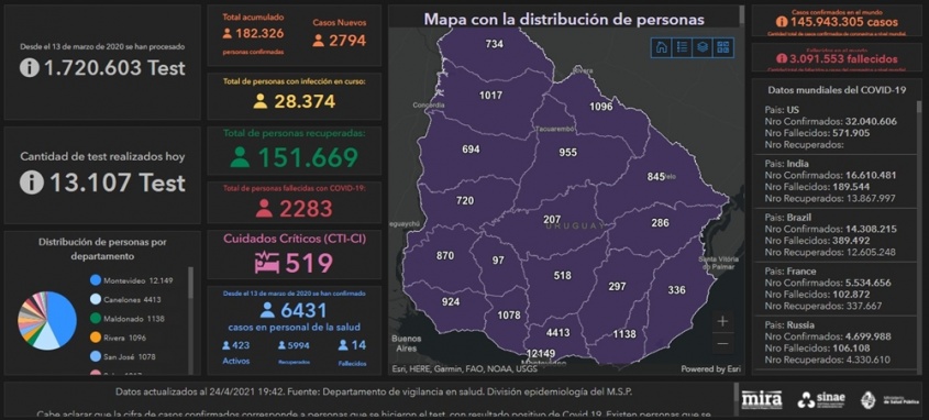 Actualmente hay 28.374 personas contagiadas, de las cuales 519 están internados en cuidados intensivos, informa el Sistema Nacional de Emergencias (Sinae).