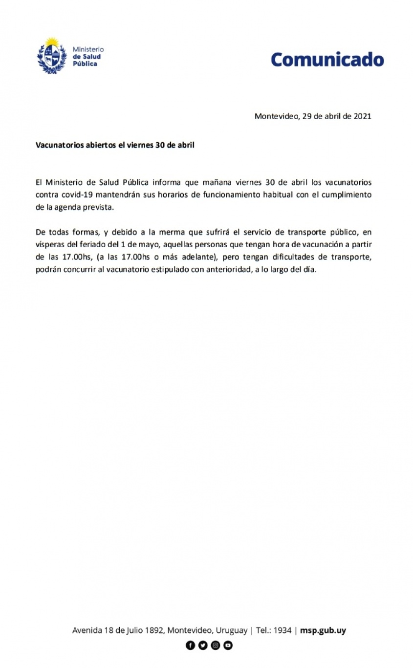 Desde el Ministerio de Salud Pública se aclara que los vacunatorios trabajaran todo el día con normalidad, pero se les ofrece a los ciudadanos que se desplazan o dependan del transporte público para ir al vacunatorio, que tienen esa opción para inocularse, es decir, antes de las 17:00 horas.