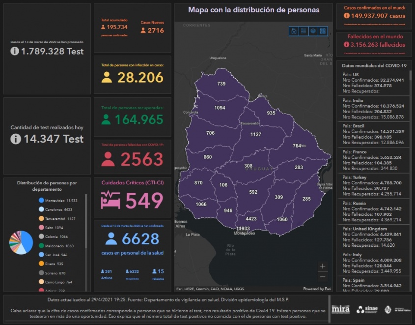 1.209 nuevos casos son de Montevideo, 348 de Canelones, 171 de Tacuarembó, 103 de Artigas, 92 de Maldonado, 91 de Paysandú, 86 de Rivera, 81 de Soriano, 80 de Durazno, 78 de Colonia, 74 de San José, 59 de Río Negro, 54 de Cerro Largo, 47 de Salto, 42 de Florida, 36 de Rocha, 31 de Treinta y Tres, 24 de Lavalleja, y 10 de Flores.