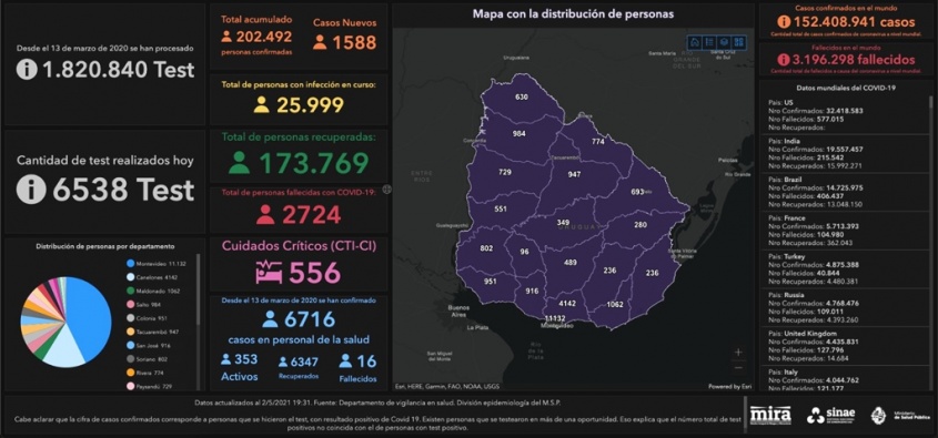 De acuerdo a la información proporcionada por el Ministerio de Salud Pública (MSP), hoy se llevaron a cabo 6.538 análisis y se detectaron 1.588 nuevos casos de Coronavirus COVID-19.