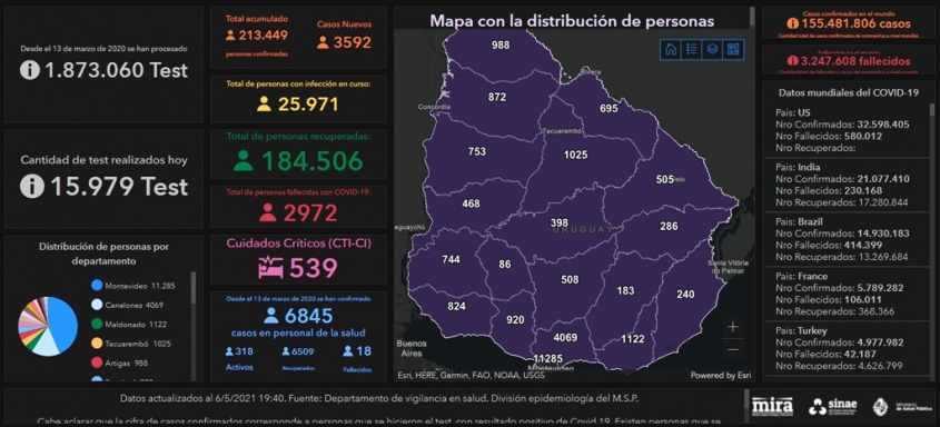 De acuerdo a la información proporcionada por el Ministerio de Salud Pública (MSP), hoy se llevaron a cabo 15.979 análisis y se detectaron 3.592 nuevos casos de Coronavirus COVID-19.