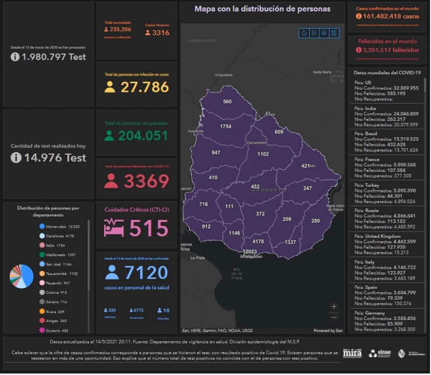 En esta jornada se realizaron 14.976 análisis y se detectaron 3.316 nuevos casos de Coronavirus, con lo cual la positividad es de 22%. Son 1.463 nuevos casos de Montevideo, 482 de Canelones, 218 de Salto, 167 de Maldonado, 137 de Tacuarembó, 129 de San José y 124 de Paysandú.