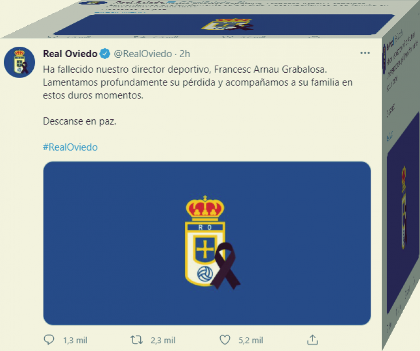 "El Real Madrid C. F., su presidente y su Junta Directiva lamentan profundamente el fallecimiento de Francesc Arnau, director deportivo del Real Oviedo y exjugador del F. C. Barcelona y del Málaga C. F", expresó el club madridista.