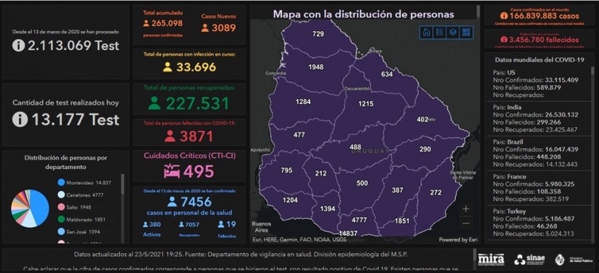 De acuerdo a la información proporcionada por el Ministerio de Salud Pública (MSP), hoy se llevaron a cabo 13.177 análisis y se detectaron 3.089 nuevos casos de Coronavirus COVID-19.