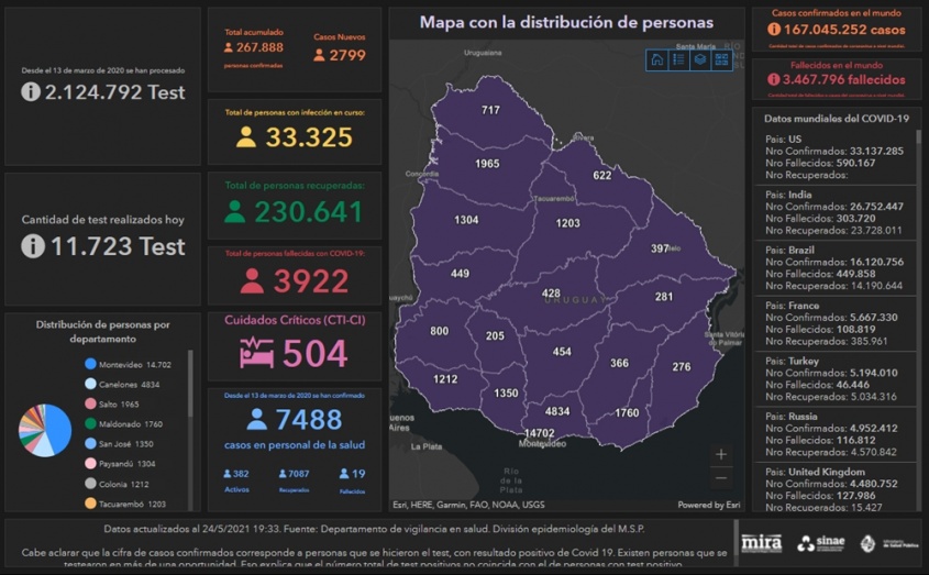 1223 nuevos casos son de Montevideo, 454 de Canelones, 261 de Salto, 122 de Colonia, 115 de Tacuarembó y 111 de Paysandú, 88 de San José, 78 de Soriano, 62 de Artigas, 56 de Maldonado, 49 de Cerro Largo, 40 de Rocha, 37 de Rivera, 26 de Lavalleja, 20 de Treinta y Tres, 15 de Flores, 14 de Durazno, Florida y Río Negro.