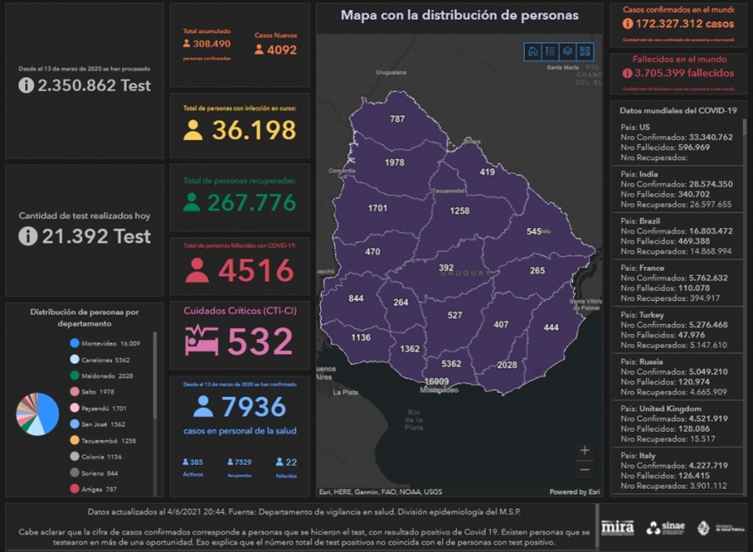 Con 56 decesos se alcanzaron las 4.516 defunciones, de las cuales 28 ocurrieron en Montevideo, en pacientes de 41 a 97 años.