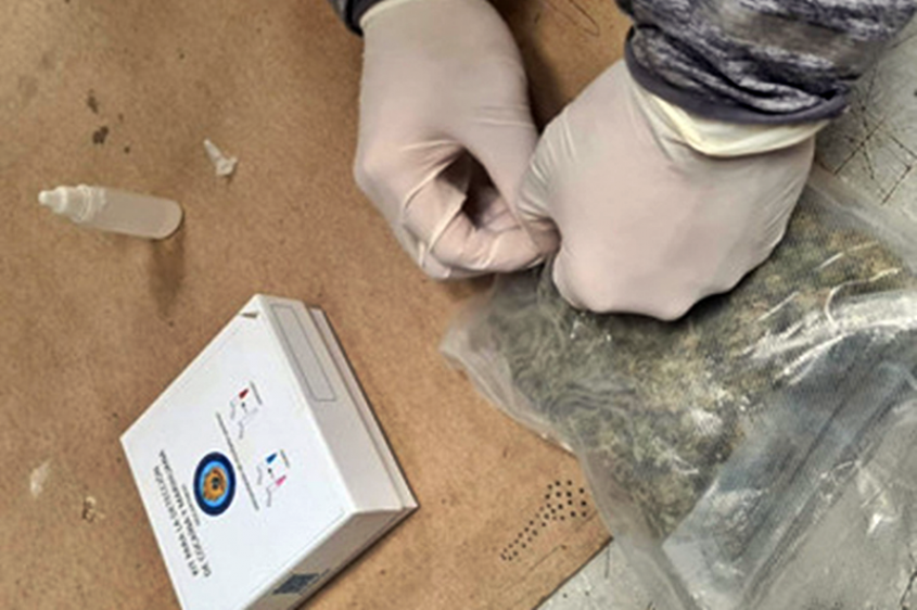 En tanto, efectivos policiales que trabajan en el Aeropuerto Internacional de Carrasco la abrieron y descubrieron dentro de una caja de cartón un sobre de carta manila con sustancia vegetal. Realizada la prueba de campo a la sustancia con reactivos para marihuana, resultó positivo y alcanzó un peso de 118 gramos.