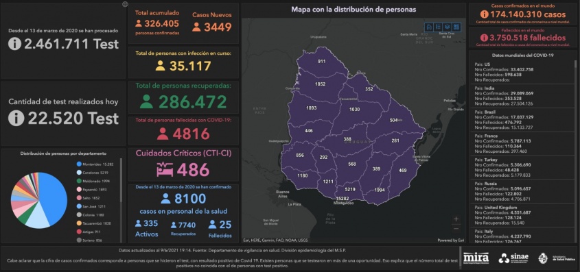 De los 3.449 casos nuevos, 1467 son de Montevideo, 465 de Canelones, 237 de Maldonado, 194 de Salto, 167 de Paysandú, 122 de Colonia, 114 de Artigas, 102 de Florida, 98 de San José, 81 de Soriano, 78 de Tacuarembó, 56 de Rocha, 55 de Río Negro, 42 de Lavalleja, 40 de Cerro Largo, 39 de Treinta y Tres, 36 de Durazno, 36 de Rivera y 20 de Flores.