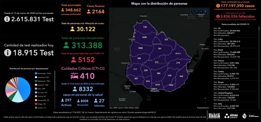970 nuevos casos son de Montevideo, 363 de Canelones, 149 de Maldonado, 124 de Salto y 110 de Paysandú.