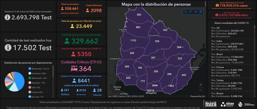 De los 2.098 casos nuevos, 892 son de Montevideo, 316 de Canelones, 107 de Maldonado, 103 de Paysandú, 97 de Salto, 78 de Florida, 77 de Colonia, 74 de Artigas, 63 de Rocha, 51 de Soriano, 49 de San José, 41 de Tacuarembó, 29 de Cerro Largo, 29 de Río Negro, 24 de Durazno, 22 de Lavalleja, 20 de Rivera, 20 de Treinta y Tres y 6 de Flores.