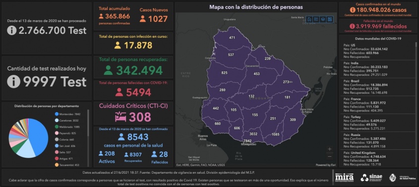 De los 1.027 casos nuevos, 513 son de Montevideo, 147 de Canelones, 97 de Maldonado, 47 de Paysandú, 46 de Colonia, 29 de San José, 22 de Artigas, 18 de Río Negro, 17 de Soriano, 16 de Treinta y Tres, 14 de Tacuarembó, 13 de Rocha, 12 de Lavalleja, 11 de Cerro Largo, 11 de Rivera, 11 de Salto, 1 de Durazno, 1 Flores y 1 de Florida.