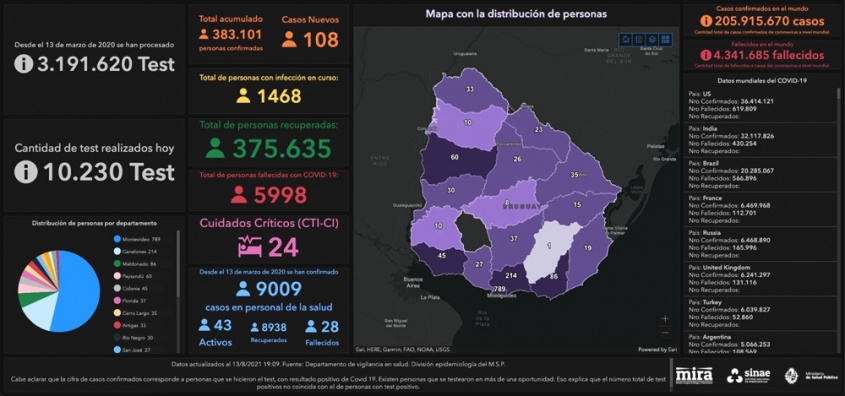 De acuerdo a la información proporcionada por el Ministerio de Salud Pública (MSP), hoy se llevaron a cabo 10.230 análisis y se detectaron 108 nuevos casos de Coronavirus COVID-19.