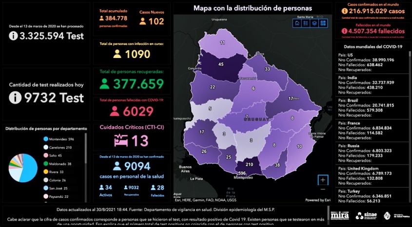 De los 102 nuevos casos, 59 son de Montevideo, 17 de Canelones, 6 de Maldonado, 5 de Rivera, 3 de Colonia, 3 de Salto, 3 de San José, 3 de Soriano, 1 de Cerro Largo, 1 de Lavalleja y 1 de Tacuarembó.