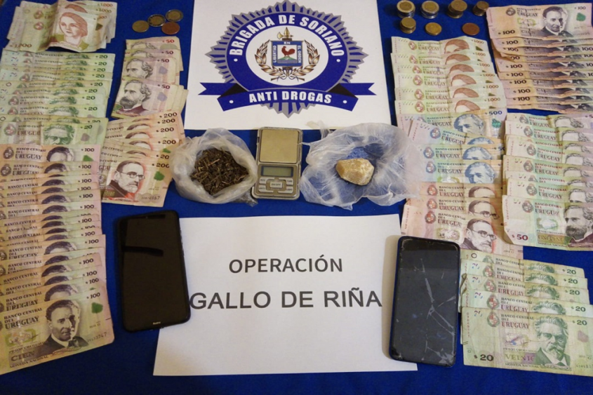 17.576 pesos uruguayos, treinta y nueve gramos de sustancia en polvo color ocre símil pasta base, diez gramos de sustancia vegetal simil marihuana, dos celulares y una balanza de precisión.