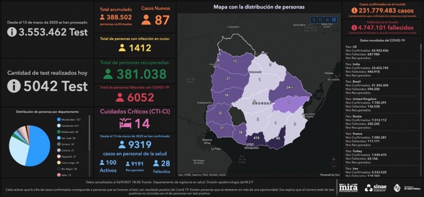 De acuerdo a la información proporcionada por el Ministerio de Salud Pública (MSP), hoy se llevaron a cabo 5.042 análisis y se detectaron 87 nuevos casos de Coronavirus COVID-19.