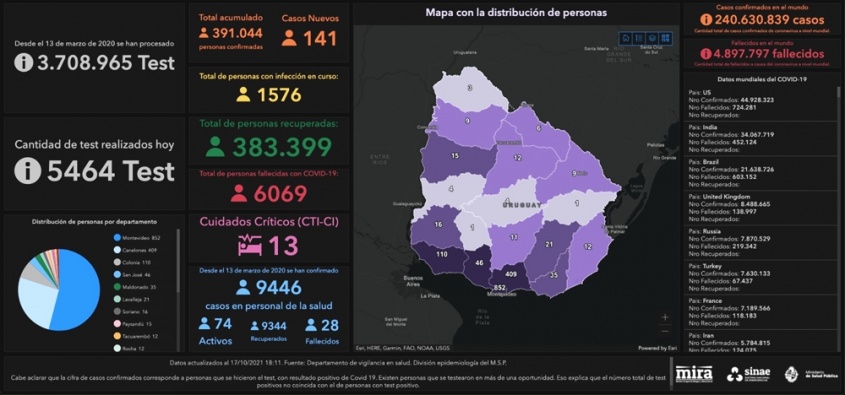 De acuerdo a la información proporcionada por el Ministerio de Salud Pública (MSP), se llevaron a cabo 5.464 análisis y se detectaron 141 nuevos casos de Coronavirus COVID-19.